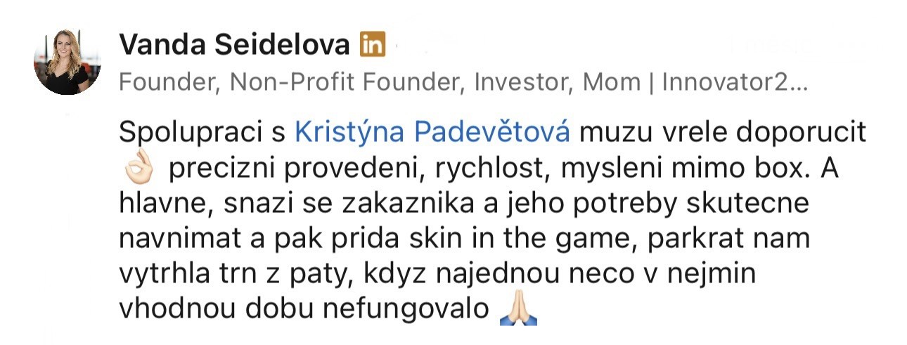 Jsem rád, že jsme se rozhodli pro spolupráci právě s ní. Díky její práci se nám začalo dařit a určitě ji doporučuju dál.