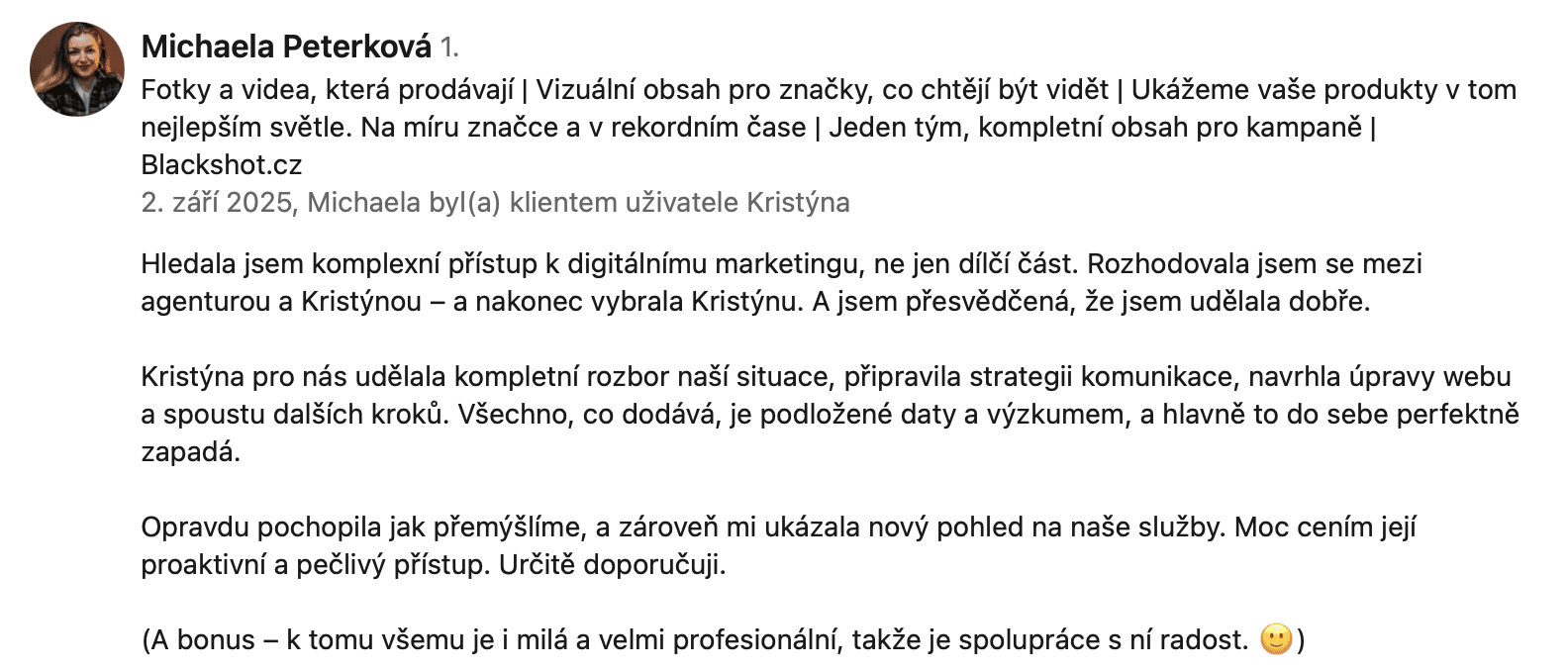 Vytvořila mi detailní analýzu i plán správy sociálních sítí a díky jejím radám nyní vidím jasný růst počtu sledujících i zákazníků. Její přístup je profesionální, ale zároveň velmi kreativní. Dokázala přesně pochopit moje potřeby a přizpůsobit strategii tak, aby odpovídala mým cílům i charakteru mého obsahu.
