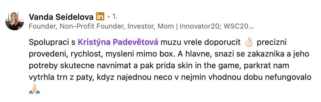 Dokázala si rychle osvojit specifika našeho projektu a přicházela s vlastními nápady a návrhy, které nás posunuly dál. Celkově byla spolupráce velmi příjemná, profesionální a efektivní. Děkujeme!